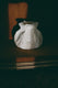 A graduate of the London College of Fashion and a former textile developer for the legendary Iris van Herpen, Kapeletzi’s textile sculpture juts out and subtly retreats from the eye, strings of cotton draped in a wave across its drum. It’s a mutable, delicate amber decoration, suggesting movement and dreamlike surreality.