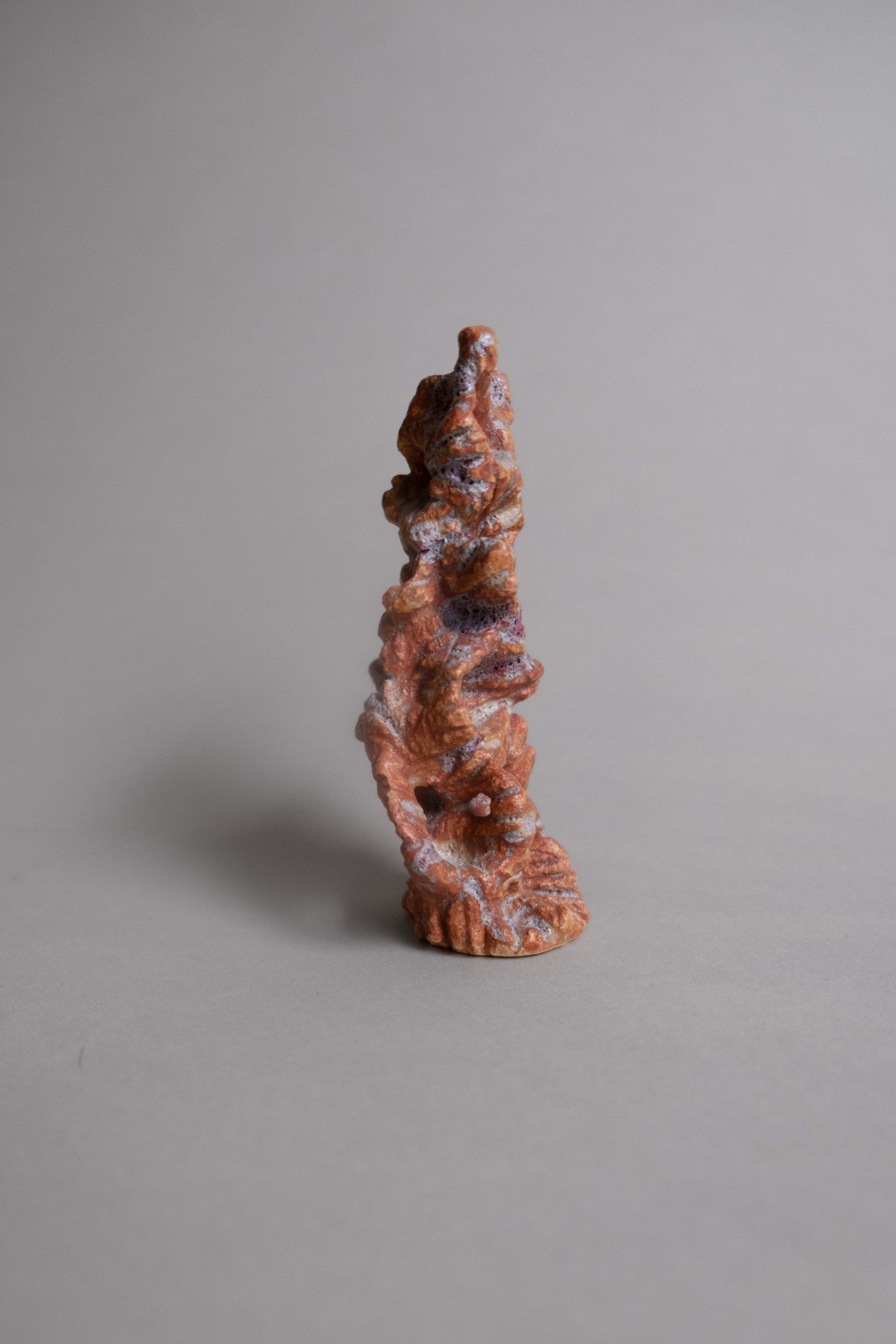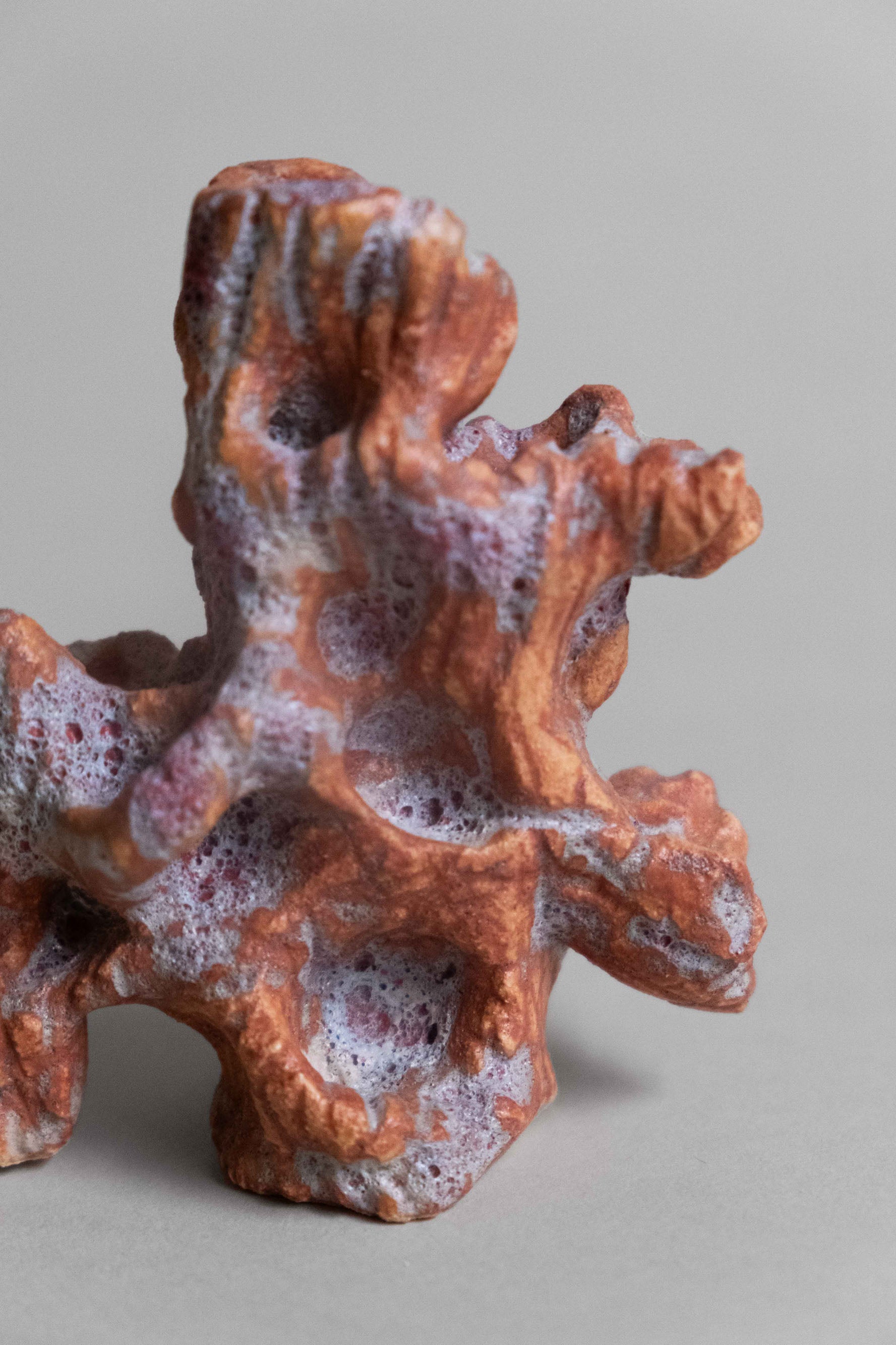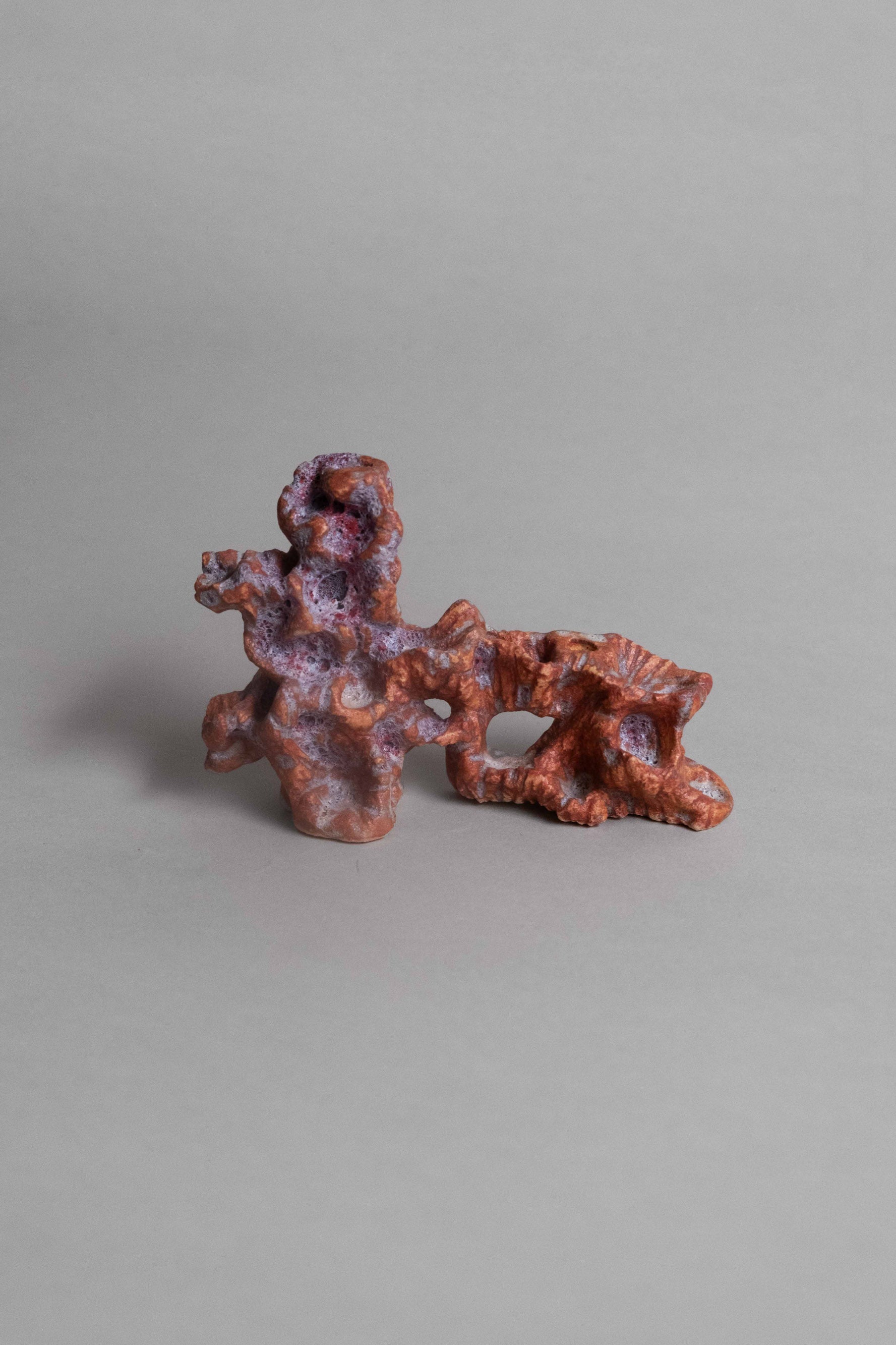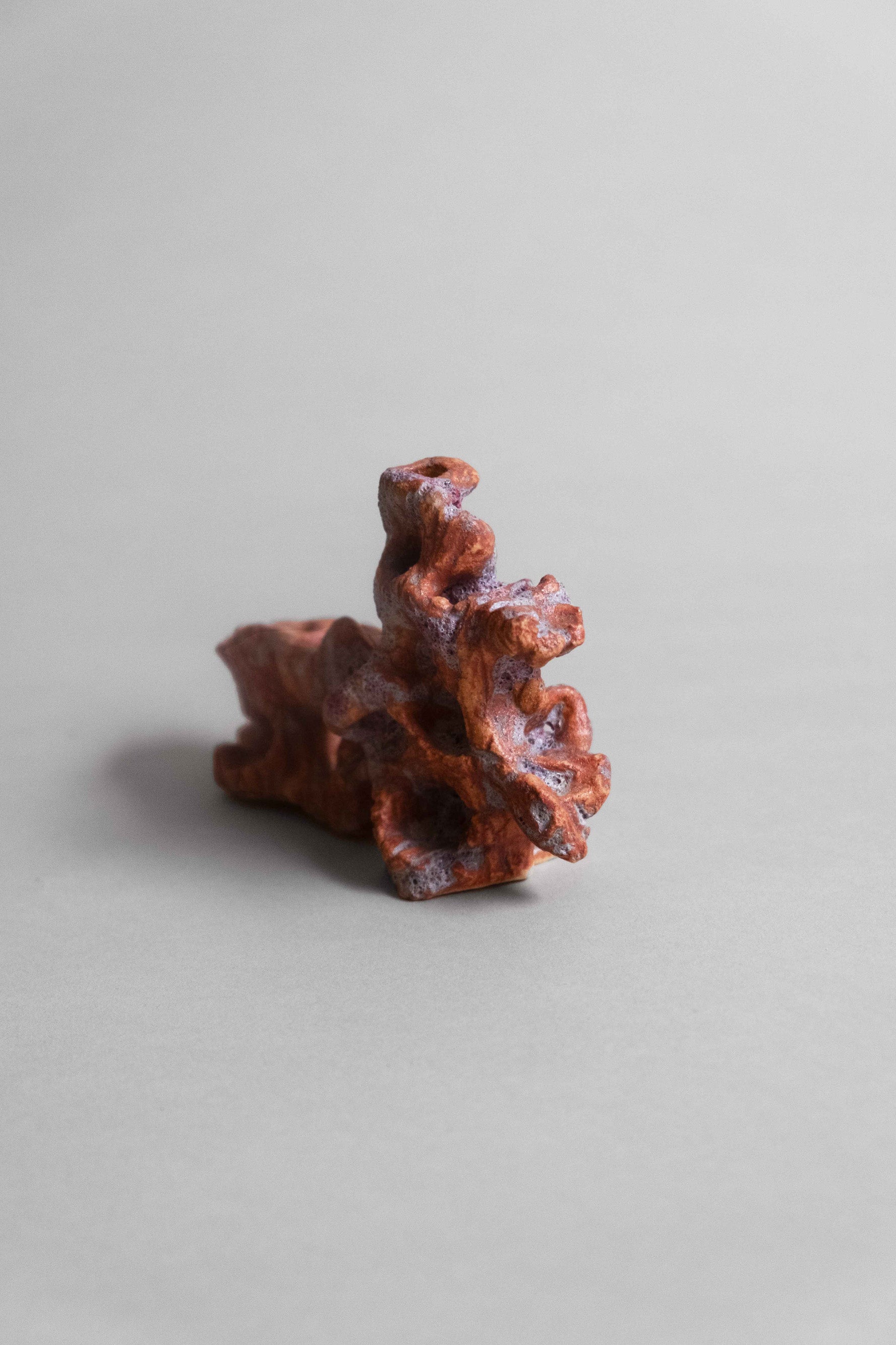 This handmade art object looks like some rusted and lilac coral bit. With stony ruffles an concavities, its surface is texturally intricate and lovingly formed.