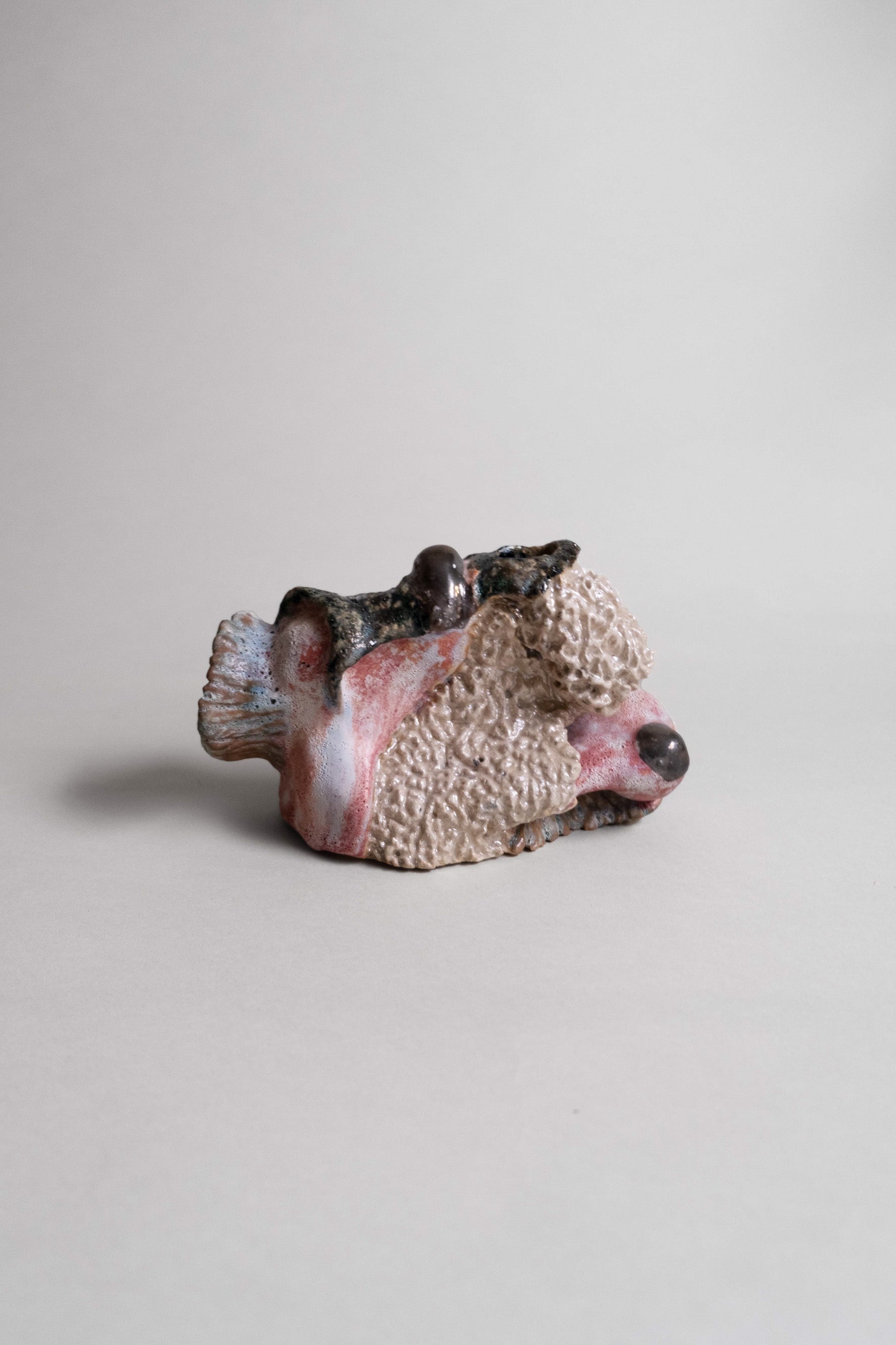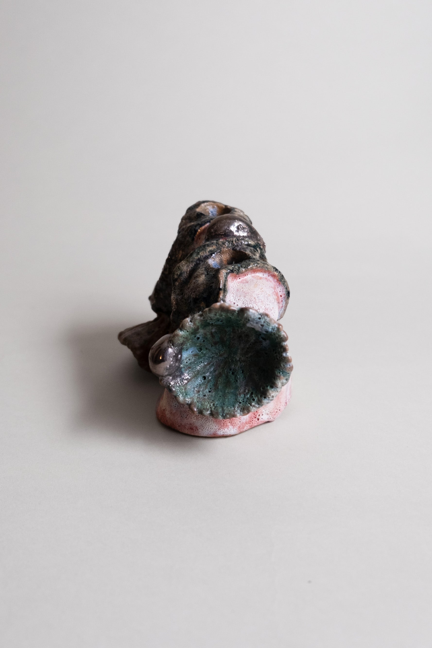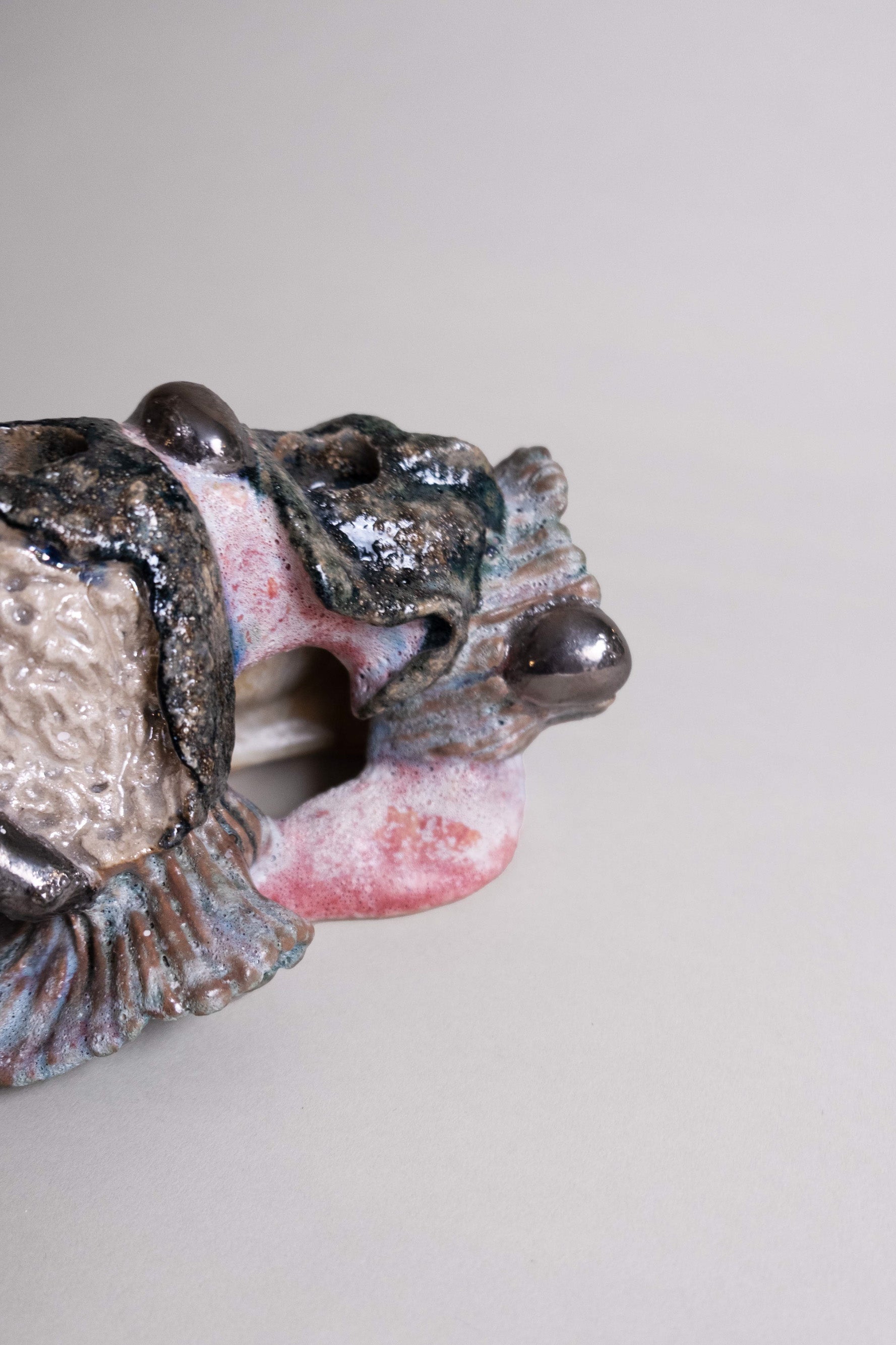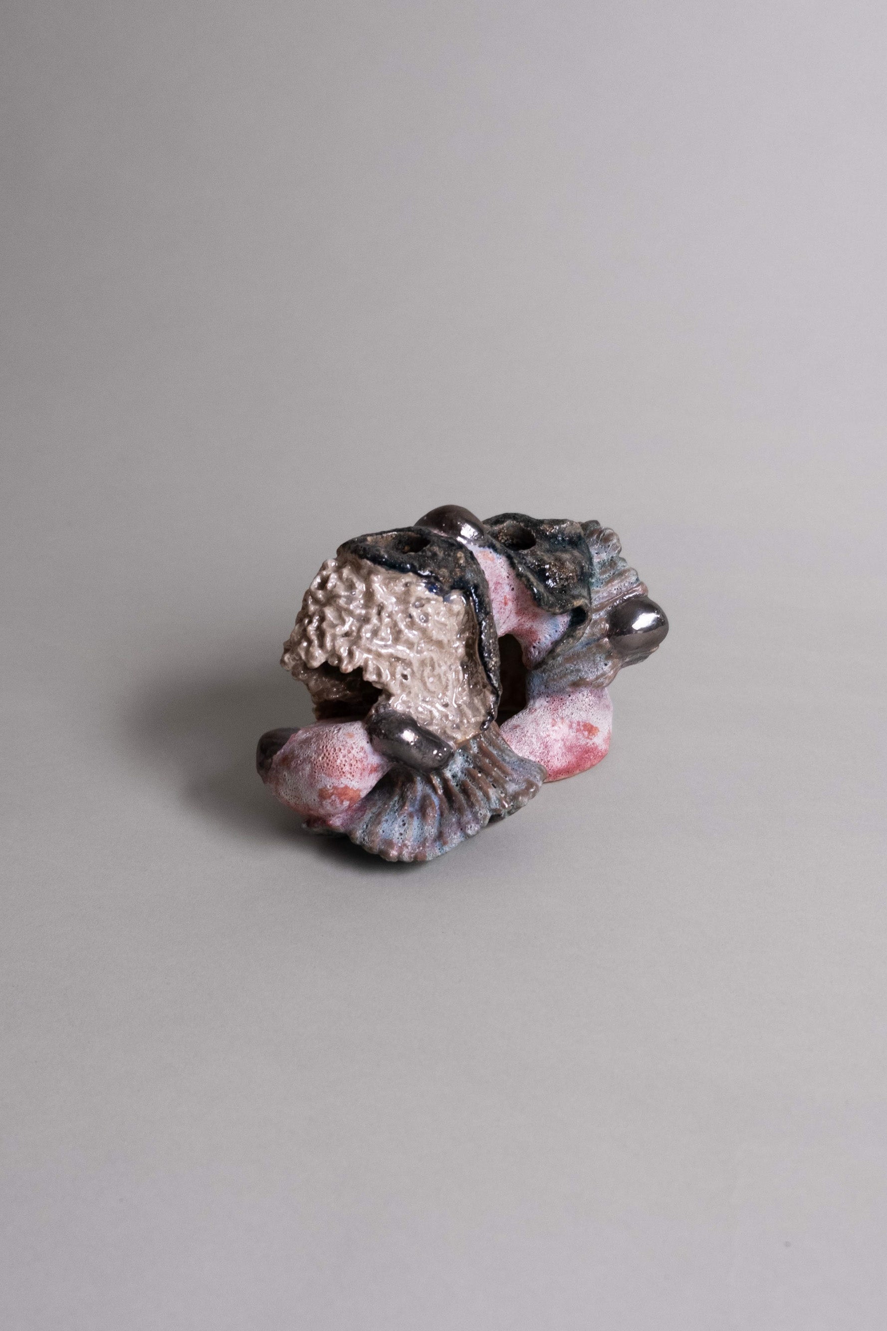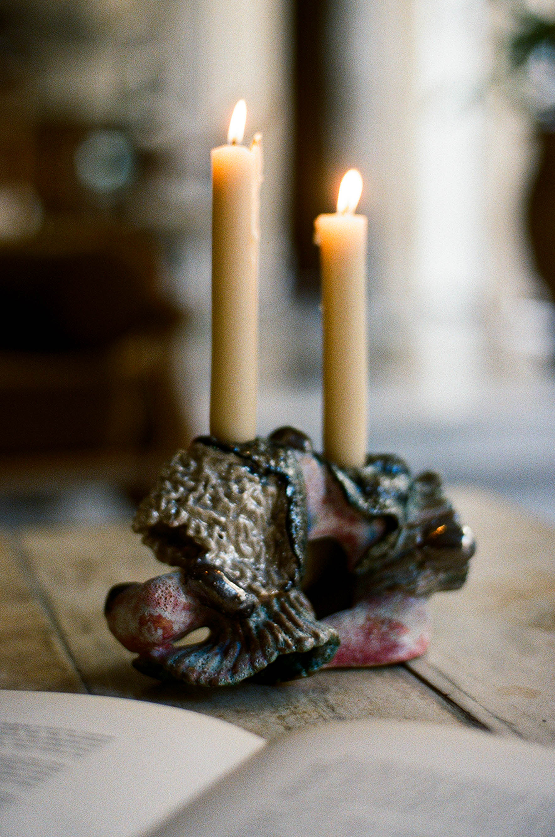 The Moonlight candleholder takes on just such an otherworldly presence. Rough-moulded textures meet glossy mineral accents. Ripples rise and dip like fossilised foam and blush-red washes run beneath. Dark metallic beads punctuate and catch light like little moons in orbit.